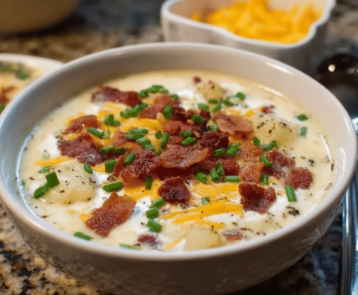 Creamy Bacon Potato Soup with crispy bacon, diced potatoes, and fresh herbs in a bowl, perfect for a comforting meal.