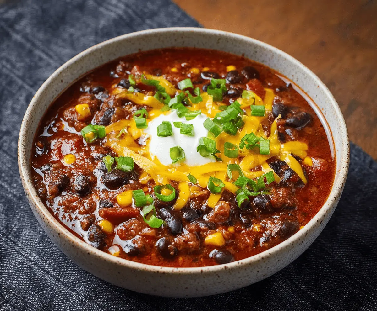 Serve the hot chili in bowls, topping each serving with shredded cheddar cheese, a dollop of sour cream, and some chopped green onions for garnish. Enjoy your warm and flavorful Black Bean Chili!