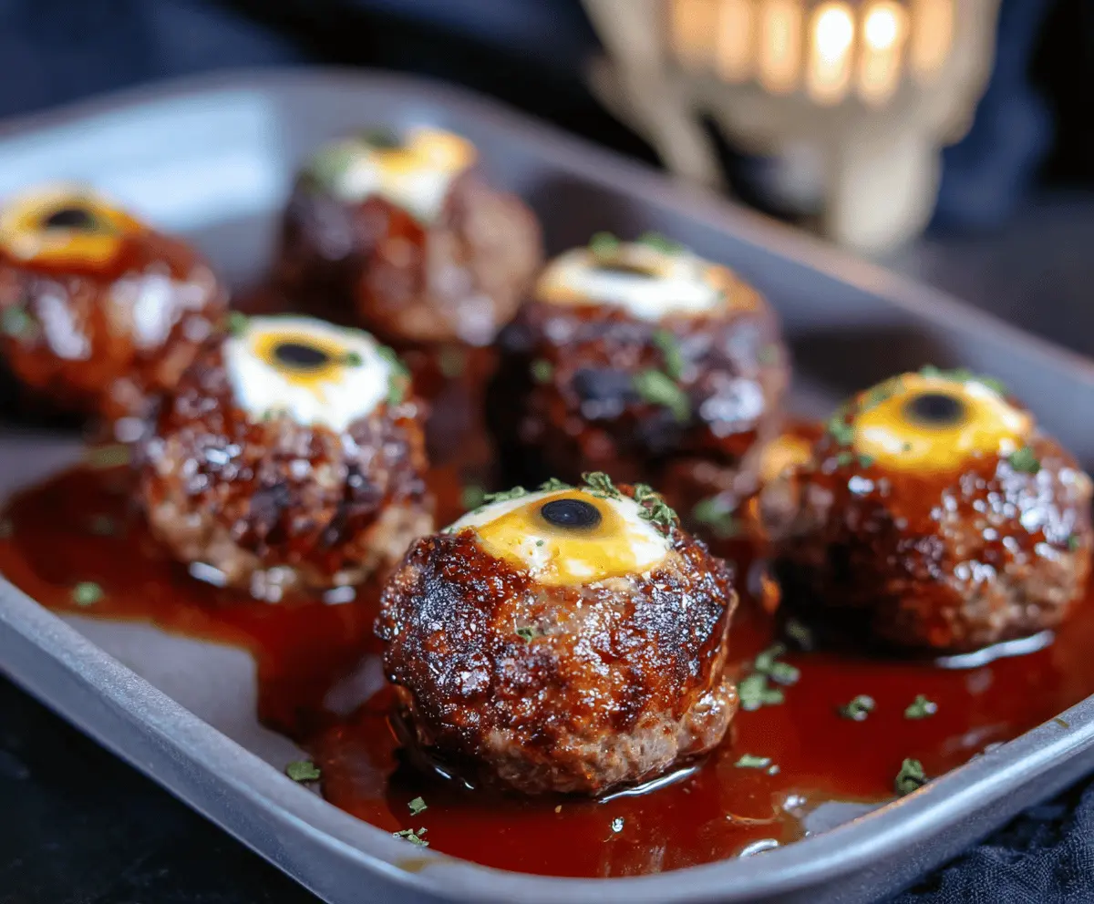 Eyeball Meatballs are a fun and spooky twist on the classic dish! These meatballs are made with ground beef and hidden surprises to look like creepy eyeballs, perfect for Halloween!