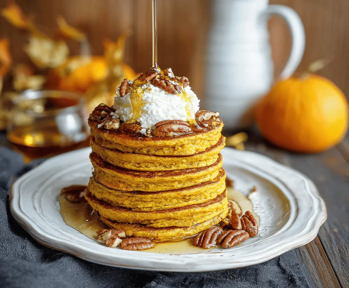 Stack the pancakes high on a plate and top them with a generous dollop of whipped cream. Drizzle with maple syrup and sprinkle with chopped pecans for extra crunch. Enjoy these warm and flavorful pancakes for a delightful breakfast treat!