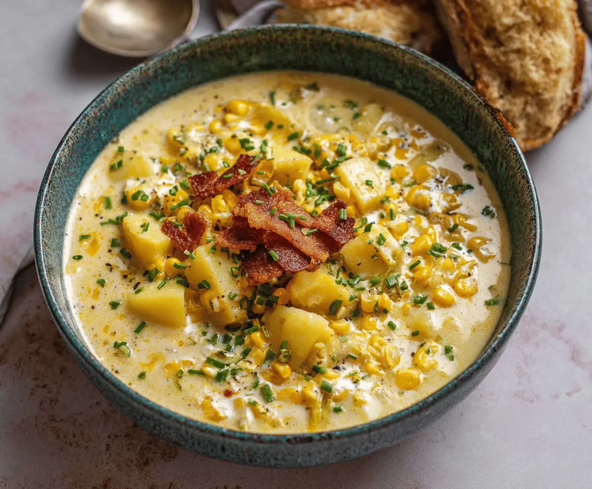 Serve your hot potato corn chowder, garnished with the reserved crispy bacon and a sprinkle of fresh chives. It pairs perfectly with warm, crusty bread for dipping. Enjoy every spoonful of this delicious warmth!