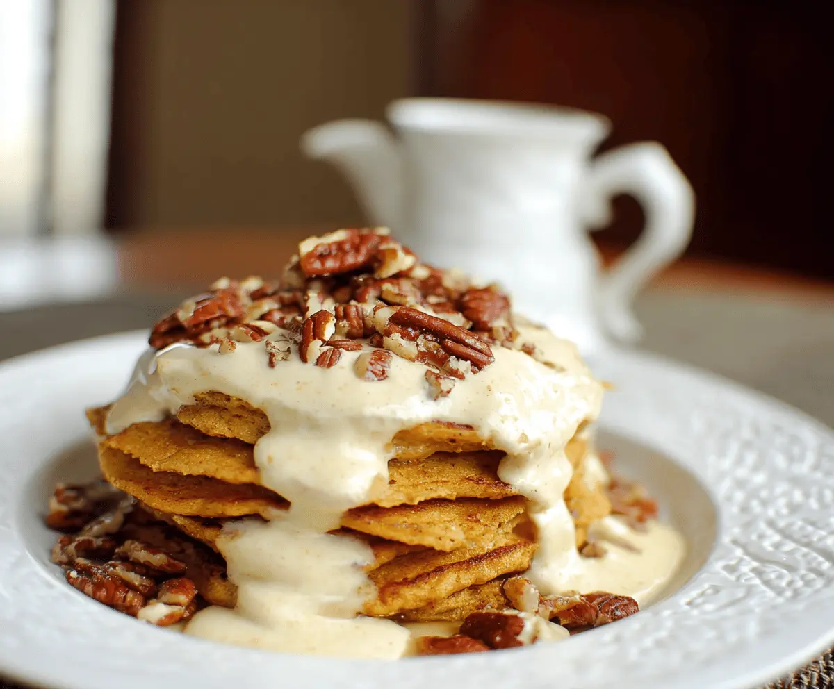 Stack the pancakes on a plate. If you’d like, add extra cream cheese filling on top, drizzle with maple syrup, and sprinkle with chopped pecans for a delicious finish. Serve warm and enjoy the creamy, pumpkin-spiced delight!