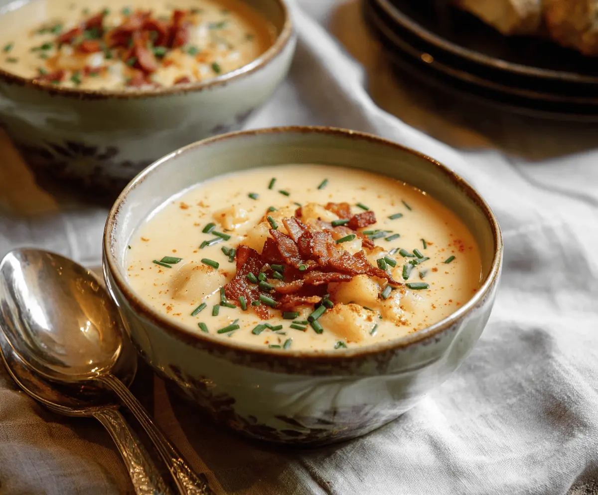 Creamy smoked Gouda potato soup served in a bowl with garnishes, perfect for a comforting, cheesy appetizer or main course.